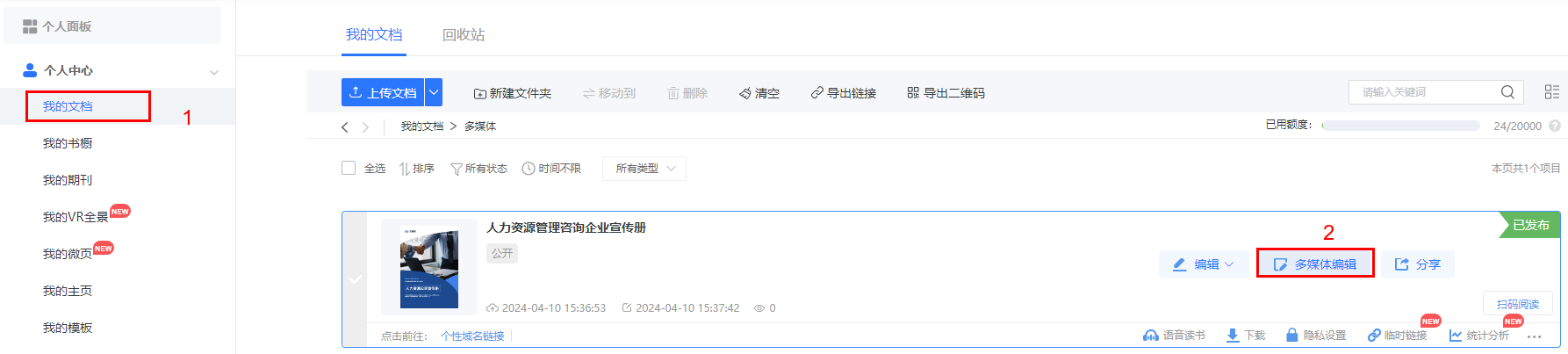 點進【我的文檔】/【文檔】,選擇對應(yīng)電子書,點擊【多媒體編輯】/【內(nèi)容編輯】。