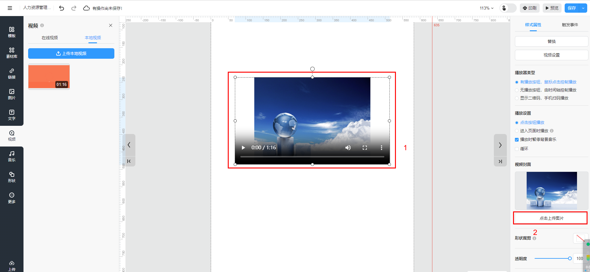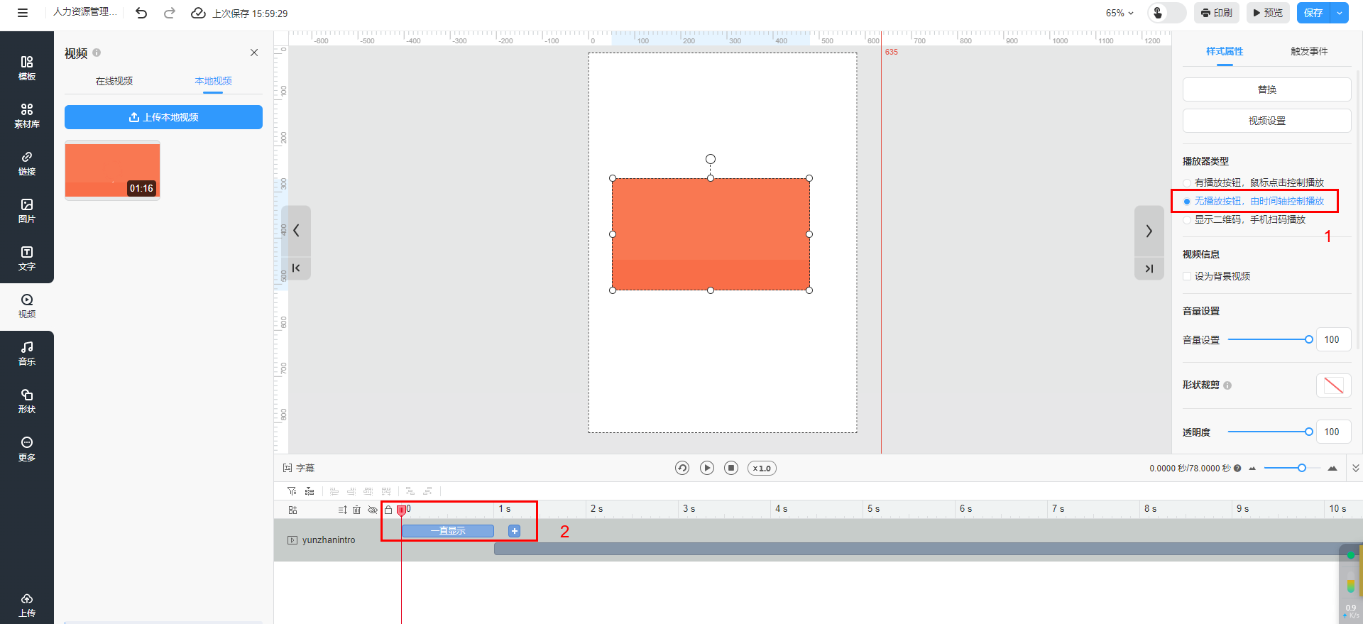 溫馨提示:【無(wú)播放按鈕,由時(shí)間軸控制播放】?jī)H支持上傳本地視頻類型勾選。