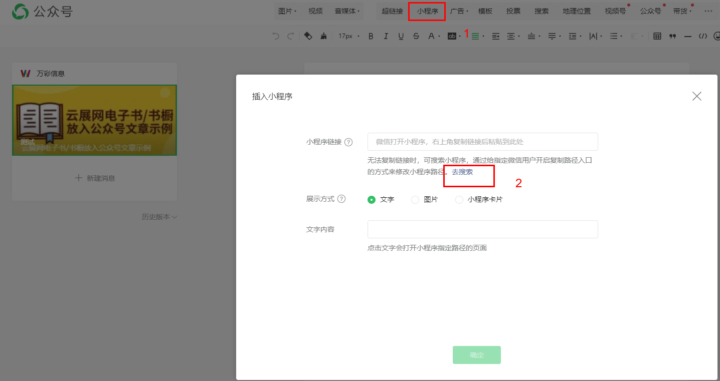 (1)創(chuàng)建公眾號文章,點擊【小程序】,【去搜索】
