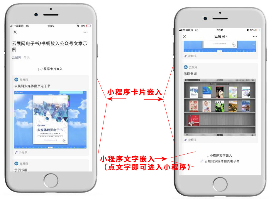 您可以把云展網生成的電子書/書櫥小程序分享到微信公眾號上,提高曝光率讓更多人看到,把電子書/書櫥小程序放到公眾號讓讀者閱讀,有三種展現形式。